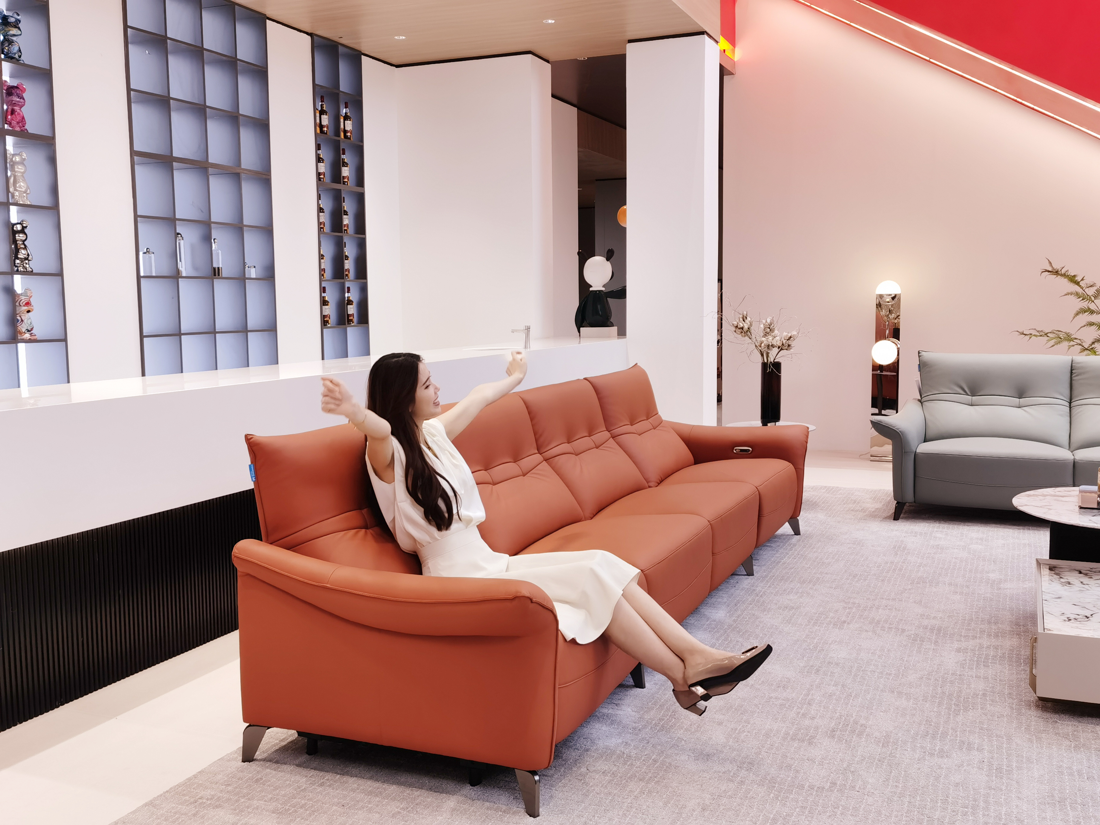 D915#橘红色奶牛皮功能沙发